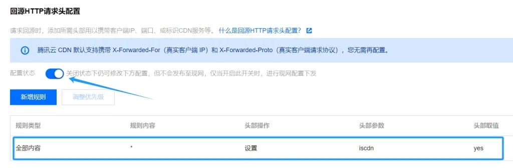 设置完毕后,重启 Nginx,再回到“腾讯云 CDN 配置 > 回源配置 > 回源HTTP请求头配置”中添加“iscdn”标头,并将值设置为“yes”,方法如下: