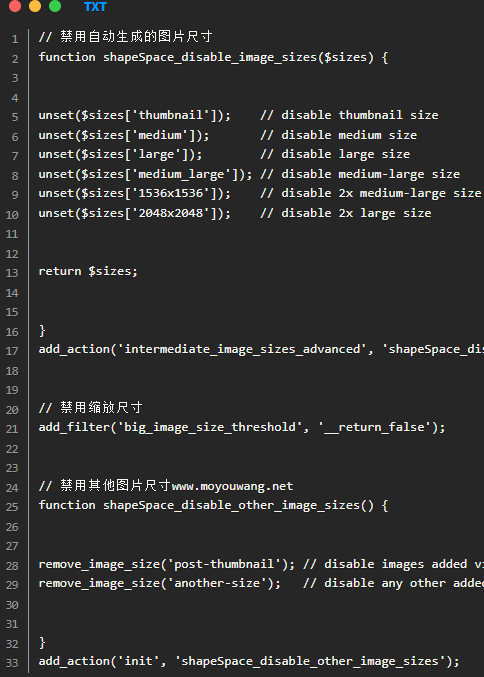 找到functions.php文件,打开,添加下面代码到底部,保存后,再上传新图片,就不会占用很多容量了,也不会生成多余的图片